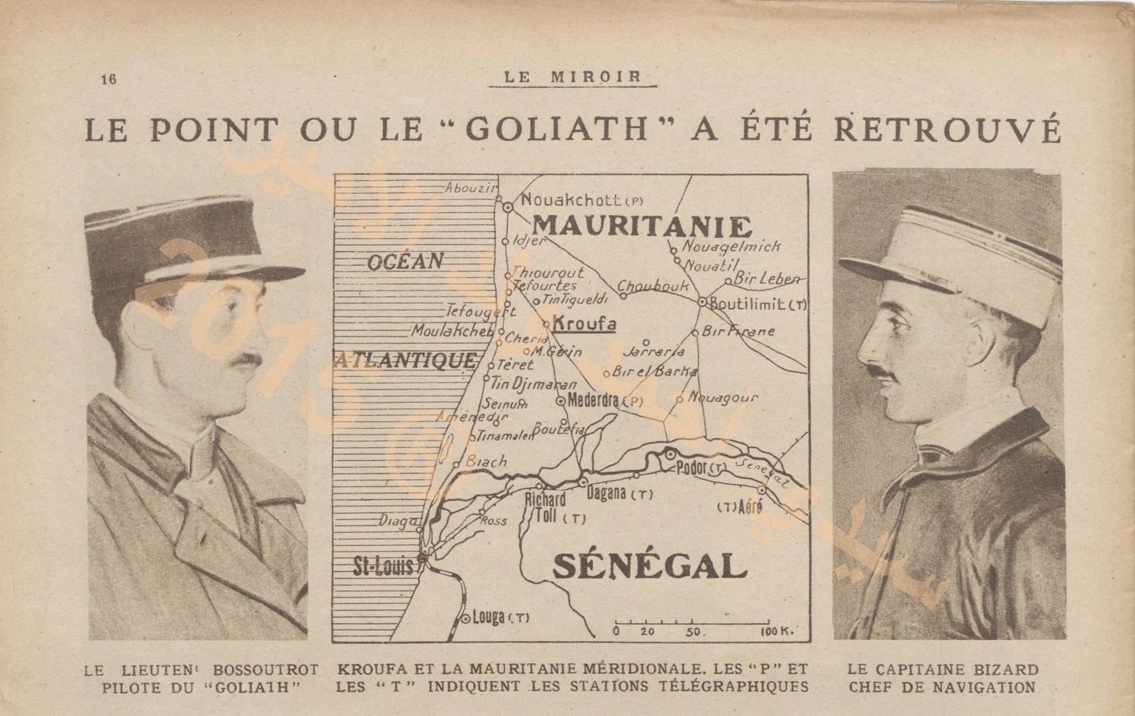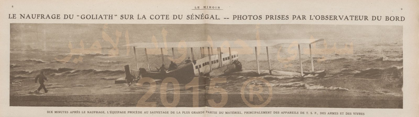 في فجر الحادي عشر من شهر أغسطس 1919 غادر ثمانية ركاب مطار توسو-لنوبل (Toussus-le-noble) بمدينة مرسيليا في جنوب فرنسا متجهين إلى دكار على متن طائرة من طراز فارمان غوليات (Farman Goliath)، وهي طائرة صنعتها شركة فرمان الفرنسية، وكانت من مفاخر الصناعات الفرنسية في ذلك التاريخ. كان الركاب جميعهم من خيرة ضباط ومهندسي الجيش الفرنسي، وممن أبلوا بلاء حسنا في الحرب العالمية الأولى، وكان ربان الطائرة الرائد بوسترو يهدف من هذه الرحلة إلى المشاركة في مسابقة تنظمها رابطة الطيران الفرنسي يحصل الفائز فيها على مبلغ مالي كبير إن هو قطع أطول مسافة خلال رحلة جوية تربط فرنسا ببعض مستعمراتها النائية. كانت الفترة التي اختارها الفريق للتوجه إلى مدينة دكار عاصمة إفريقيا الغربية الفرنسية (AOF) في ذلك التاريخ فترة الأمطار ودرجات الحرارة المرتفعة وهو ما أثر على مجريات الرحلة ومسارها ونتائجها.